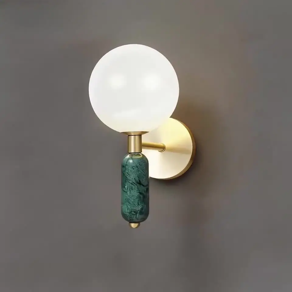 Haugesund is a modern wall lamp combining copper, marble, and glass to create a timeless luxury look. The round stone shade diffuses light softly, making it ideal for bedrooms, living rooms, and hallways.