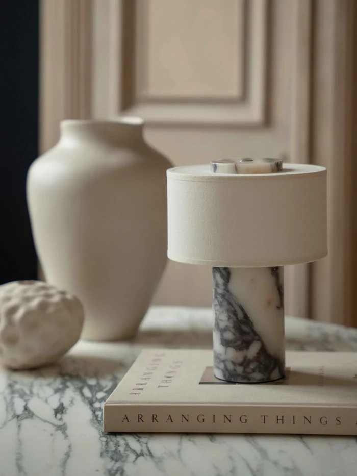 The solid marble base makes every piece unique, with natural veins and colour variations that ensure no two lamps are exactly alike. The softly shaped linen shade diffuses the light to create a warm, inviting glow that adds calm and atmosphere to your home.